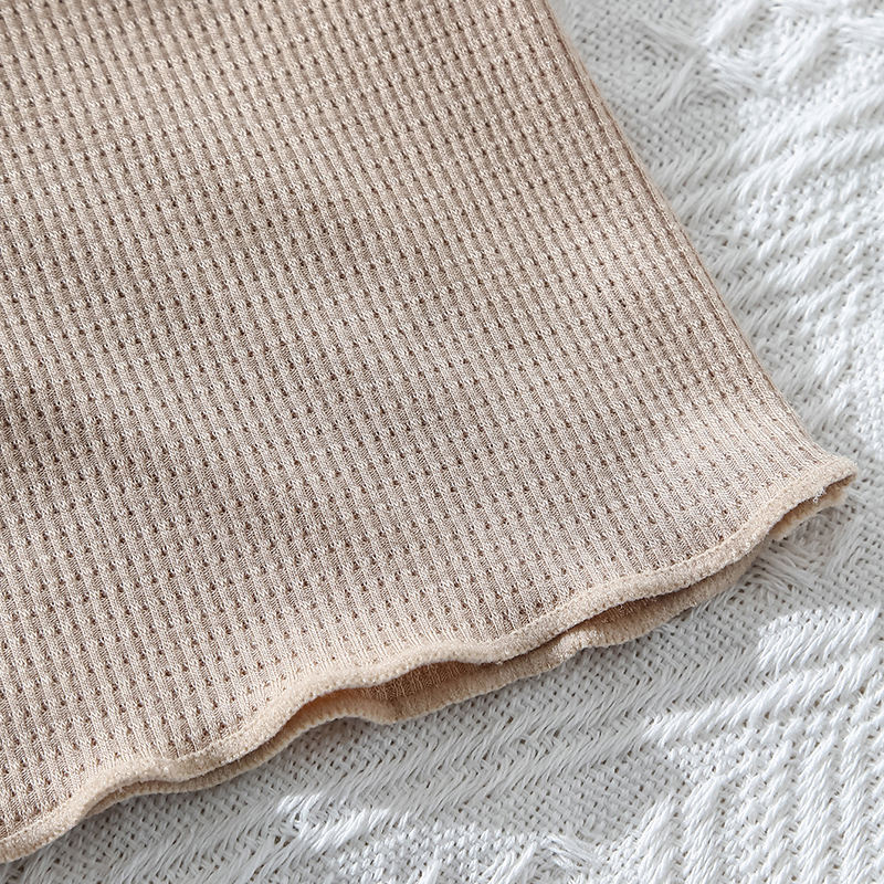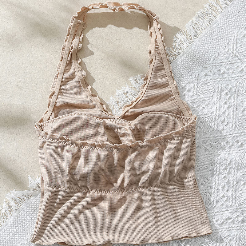 This fashionable Ruffle Trim Seamless Halter Crop Top is the perfect piece for warm weather and casual styling. It is constructed from a soft, stretchable ribbed knit fabric that ensures a flattering, close-to-body fit and offers light support. The design features an attractive halter neckline with delicate, wavy ruffle trim along the edges, adding a sweet, feminine touch. Small, subtle stitching details below the neckline enhance the bust shape. Ideal for pairing with high-waisted shorts or skirts, this top is both comfortable and effortlessly stylish for a chic, summery look.