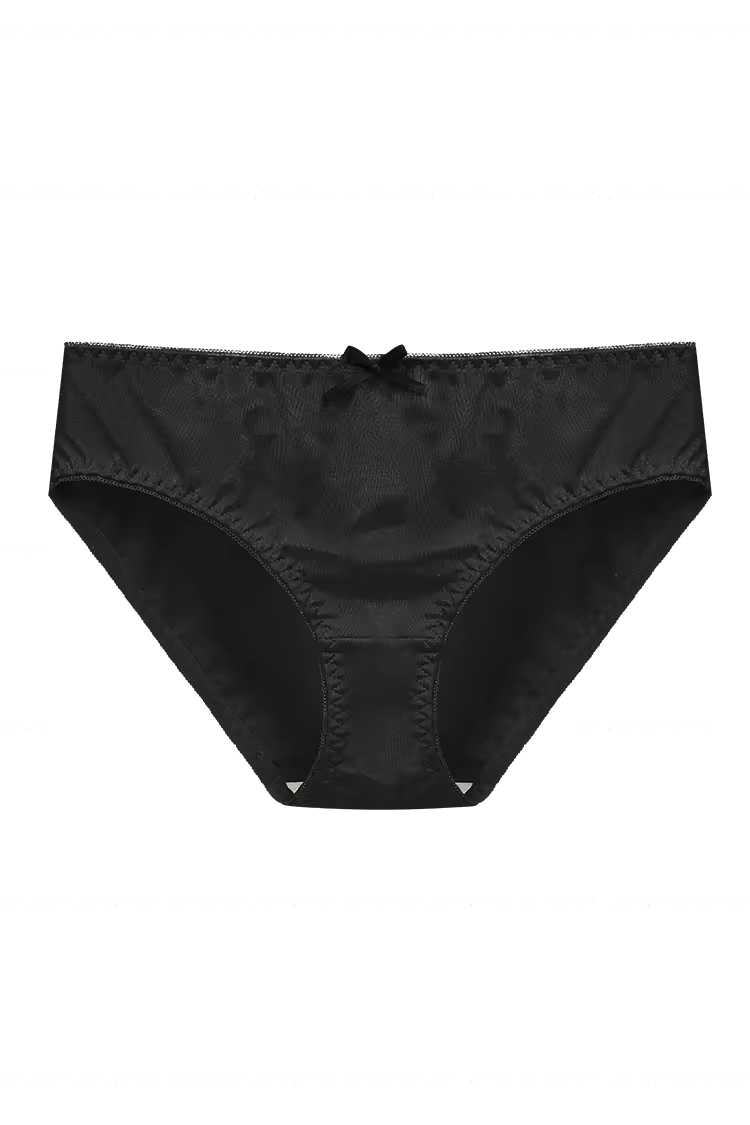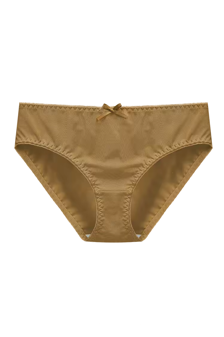 Shiny, dark brown bikini panty with a subtle shimmer. Features a small decorative bow. Indulge in this elegant, bikini-cut panty crafted from a smooth, lustrous satin-like fabric in a deep chocolate brown. The minimal detailing includes delicate trim along the edges and a tiny satin bow at the center front. This brief offers a comfortable, low-rise fit with moderate coverage and a sophisticated, slightly shimmering finish.