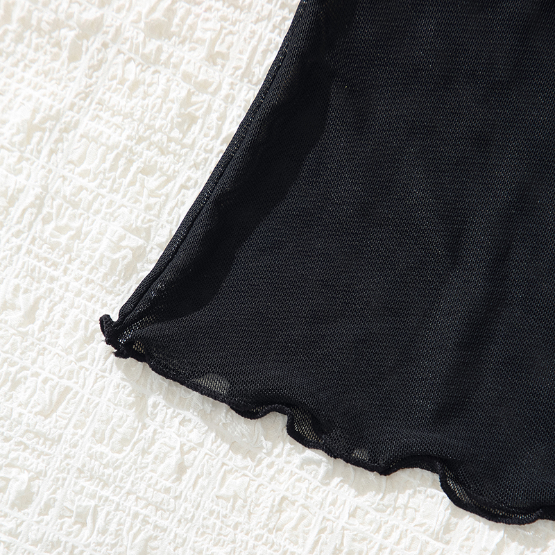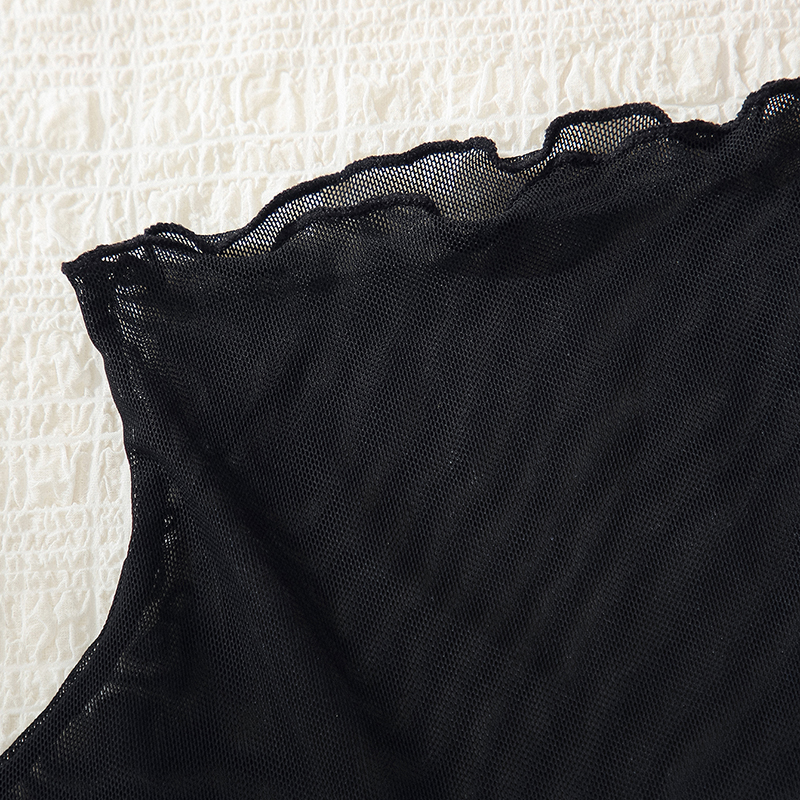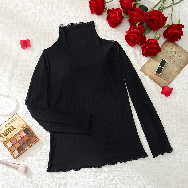 Embrace a blend of elegance and romance with this sheer black mesh top. Featuring a chic turtleneck/mock neck and delicate frill lettuce trim on the collar and cuffs, this long-sleeve blouse is perfect for layering or wearing as a subtle statement piece. Its soft, see-through fabric offers a comfortable, body-hugging fit that adds a touch of sultry sophistication to any outfit, from a night out to a stylish casual look.