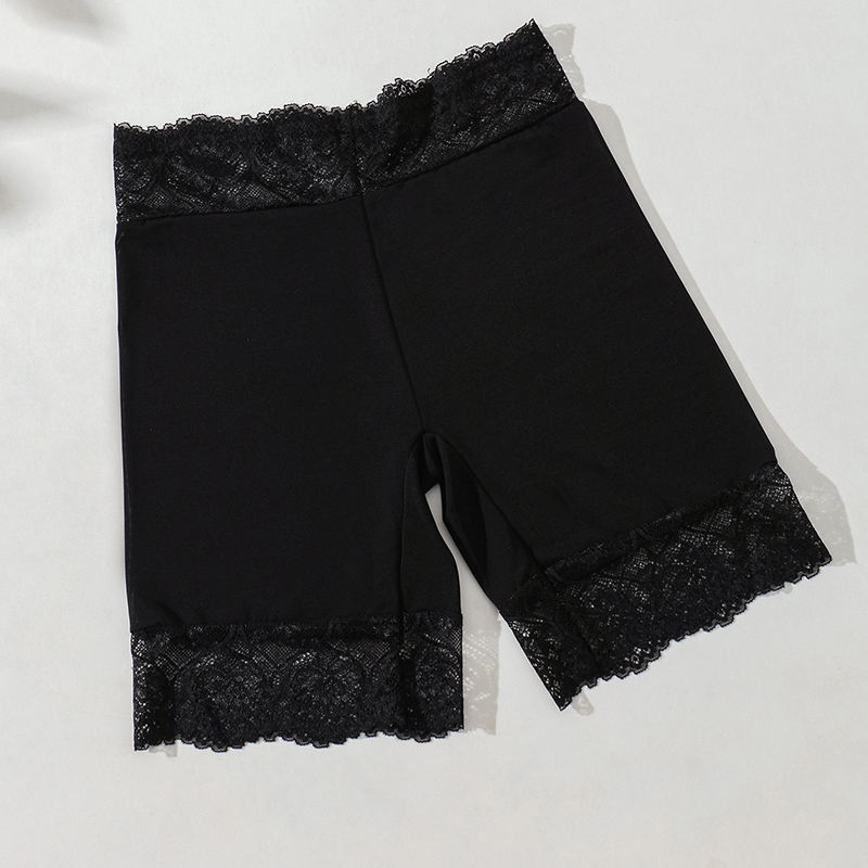 These practical yet feminine shorts are designed to be worn discreetly as a protective undergarment. They are made from a lightweight, sheer mesh fabric that is highly breathable and minimizes bulk under dresses or skirts. The garment features a comfortable high waistband and hem finished with delicate, contrasting lace trim. This design provides modesty and helps prevent chafing without the heaviness of typical shapewear. They offer a secure and seamless fit, ensuring comfort and peace of mind when wearing shorter or flowy attire.