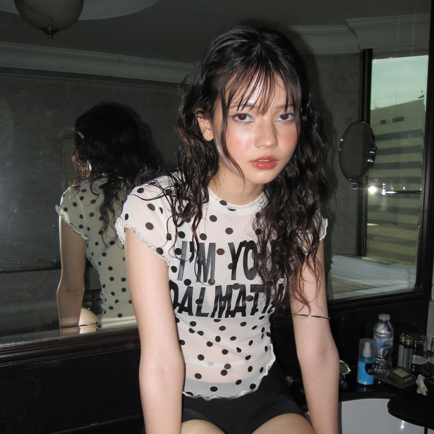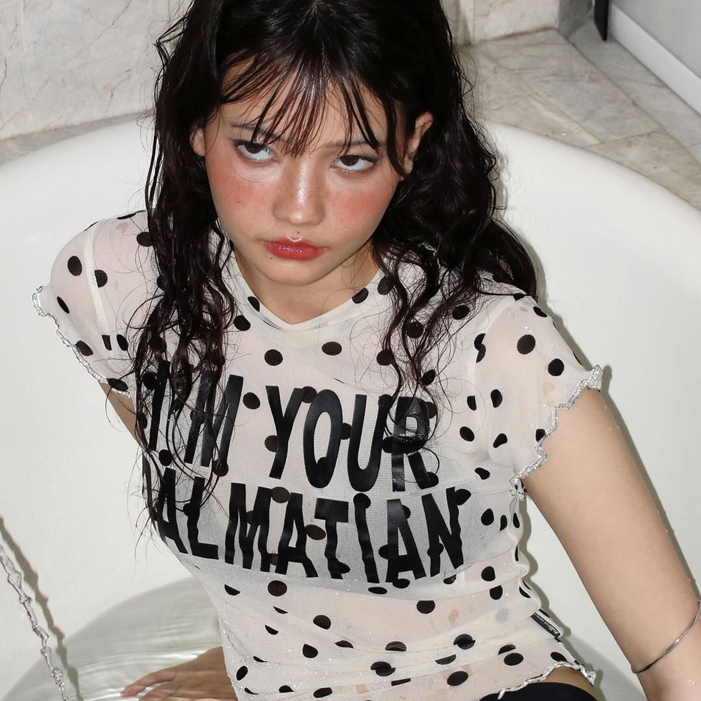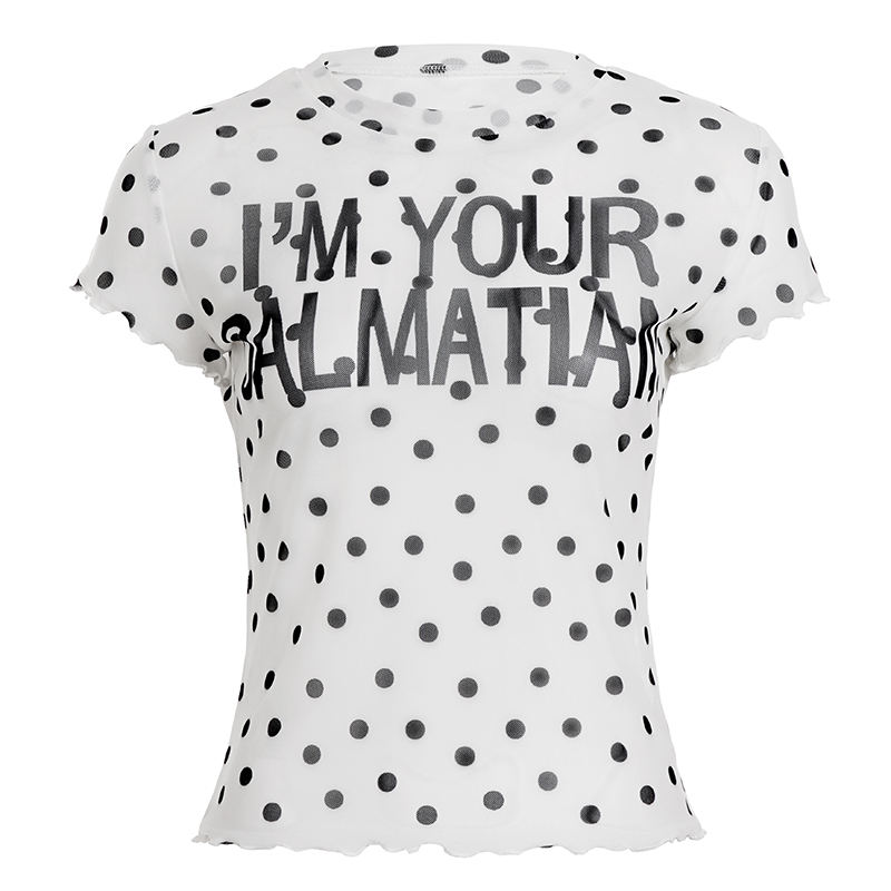 This playful t-shirt features a lightweight, sheer mesh fabric covered in an all-over polka dot pattern, offering a unique and edgy casual style. It has a classic crew neckline and short, softly ruffled cap sleeves. The center is adorned with a bold, contrasting printed graphic or text, making it a statement piece. Due to its transparency, this top is ideal for layering over camisoles or bralettes to create a modern, subversive, or punk-inspired aesthetic.