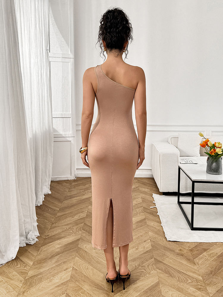 Sleek one-shoulder bodycon midi dress in nude/beige. Asymmetrical neckline and figure-hugging fit. Chic essential! This sleek and...