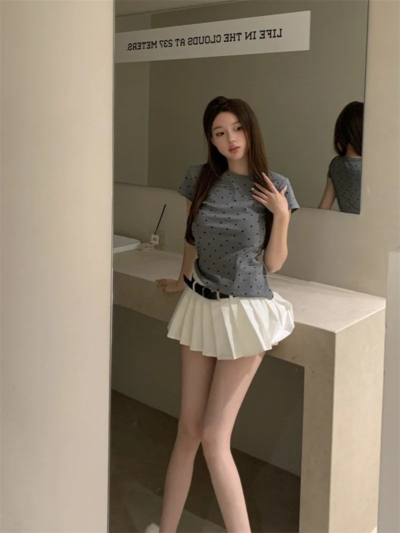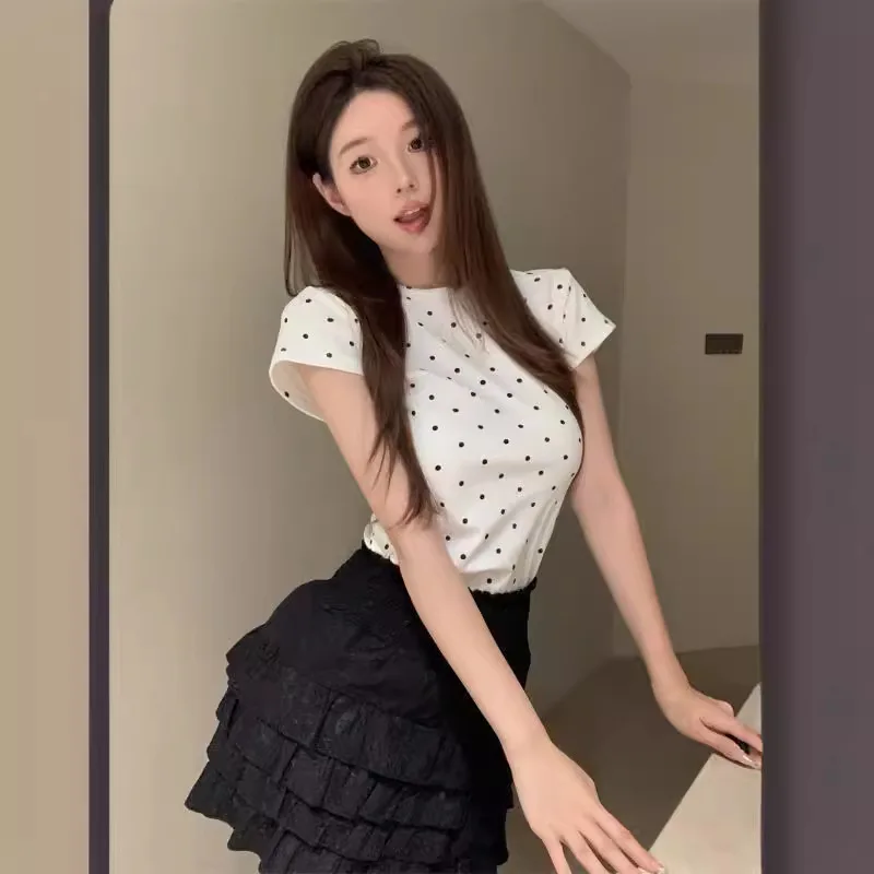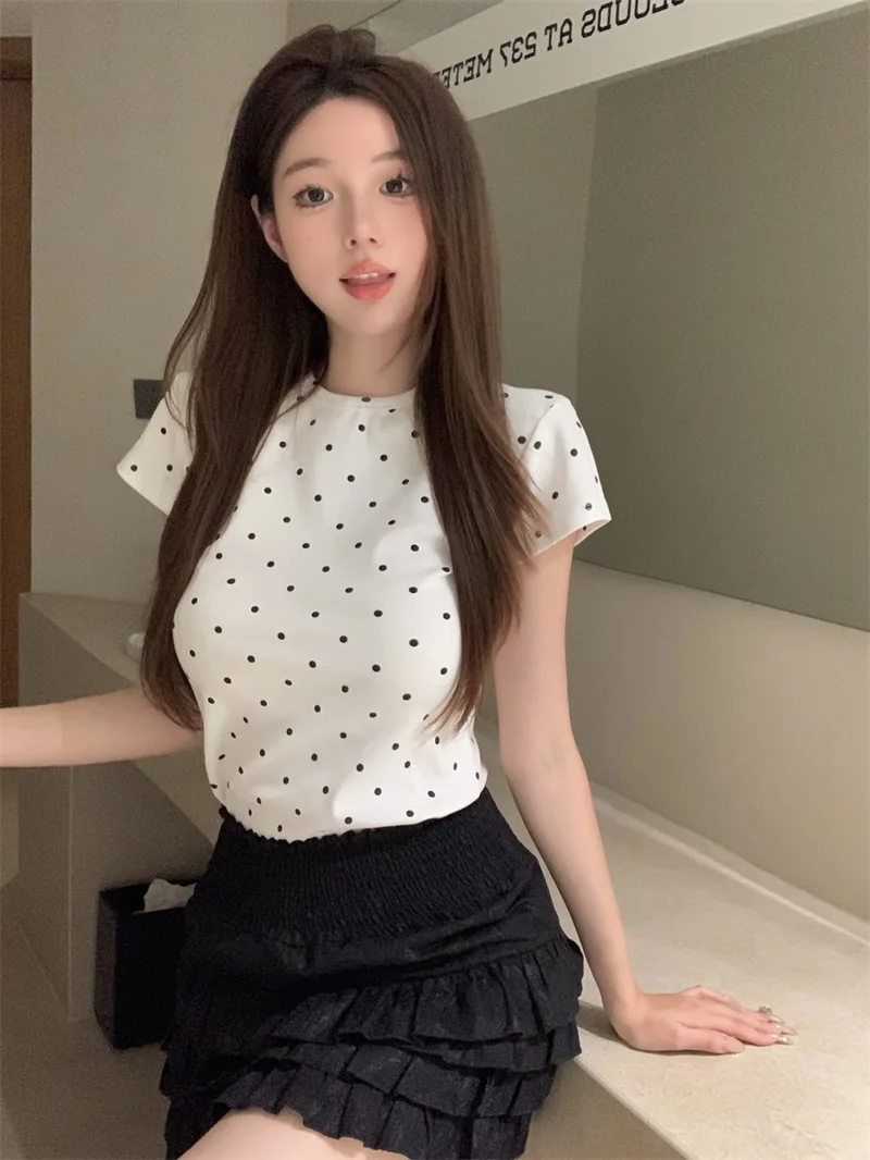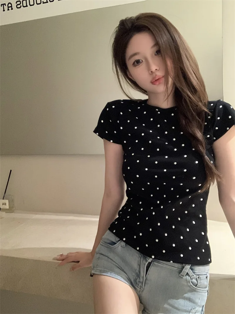 Slim-fit Graphic Tee Vintage Wave Point Short-sleeved Blouse Versatile T-shirt for Women