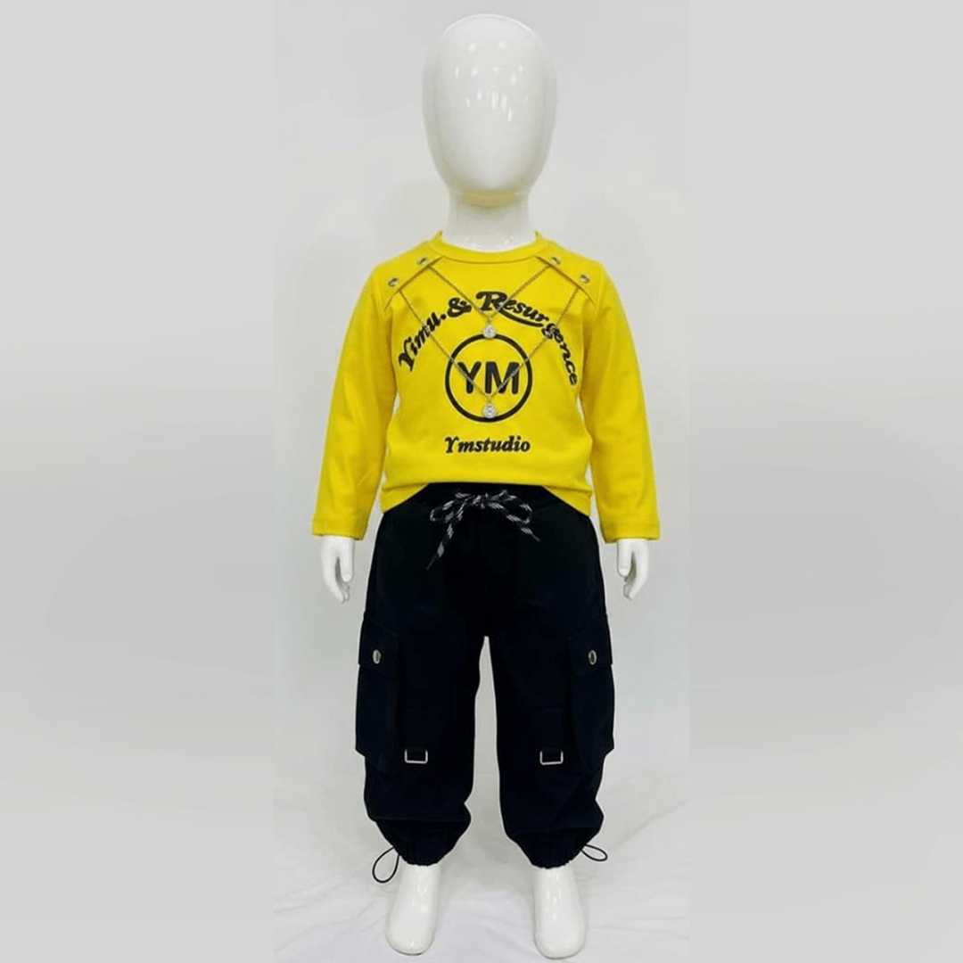 This set features a brightly yellow long-sleeve T-shirt with a black graphic print and decorative strap details. It's paired with stylish black cargo pants that have large utility pockets, buckle accents, and adjustable drawstrings at the ankles. Perfect for a trendy, comfortable, and casual look.