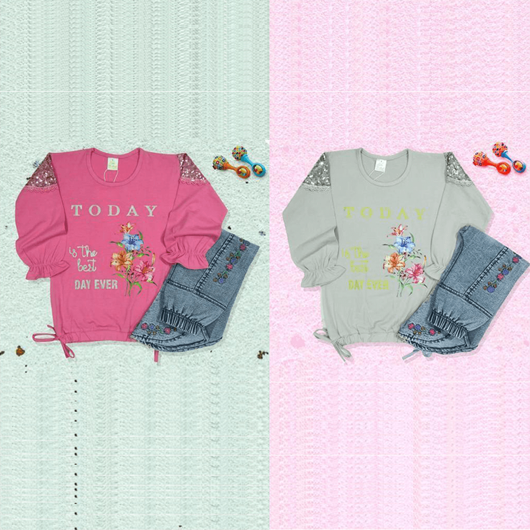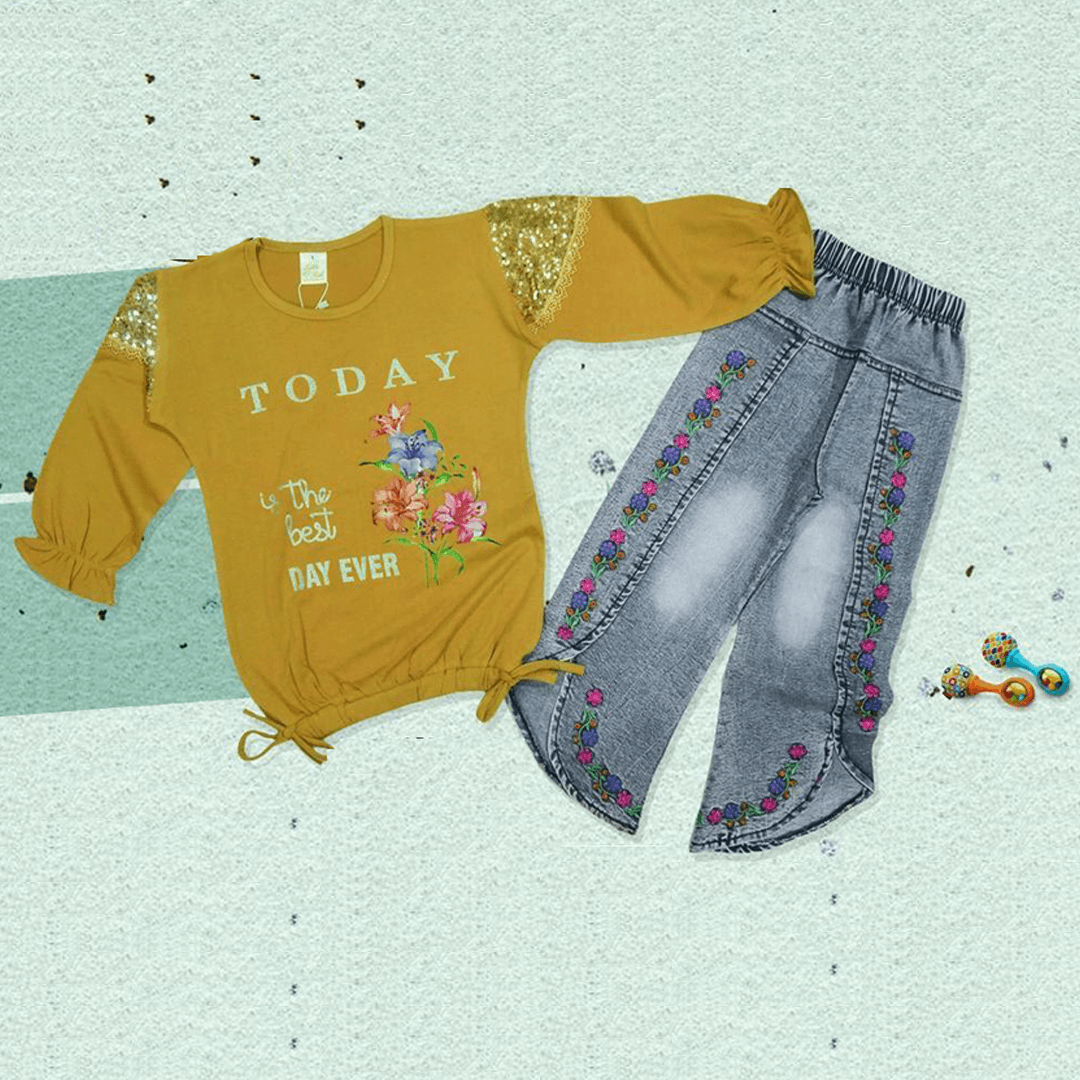 Bring a touch of sparkle to her wardrobe with this stylish two-piece set. The outfit includes a vibrant mustard yellow long-sleeve top with a statement graphic that reads, "Today is the best day ever", surrounded by a lovely floral bouquet. The shoulders and cuffs are adorned with eye-catching gold sequins for a dazzling effect. The top is paired with fashionable light-wash denim jeans that feature beautiful, colorful embroidered floral vines running down the legs, adding a unique, bohemian touch.