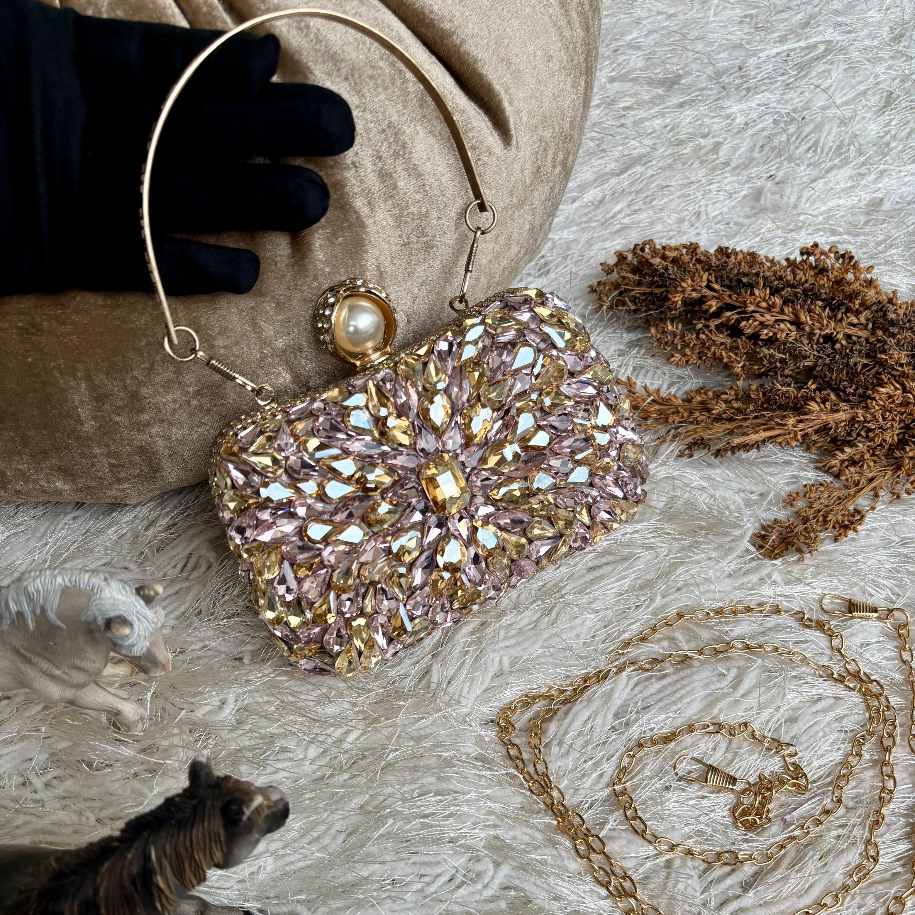 A sophisticated rectangular clutch showcasing a blend of rose gold, and champagne stones in a centered, star-like arrangement. It has a sleek, rounded gold top handle and a prominent pearl and crystal closure.