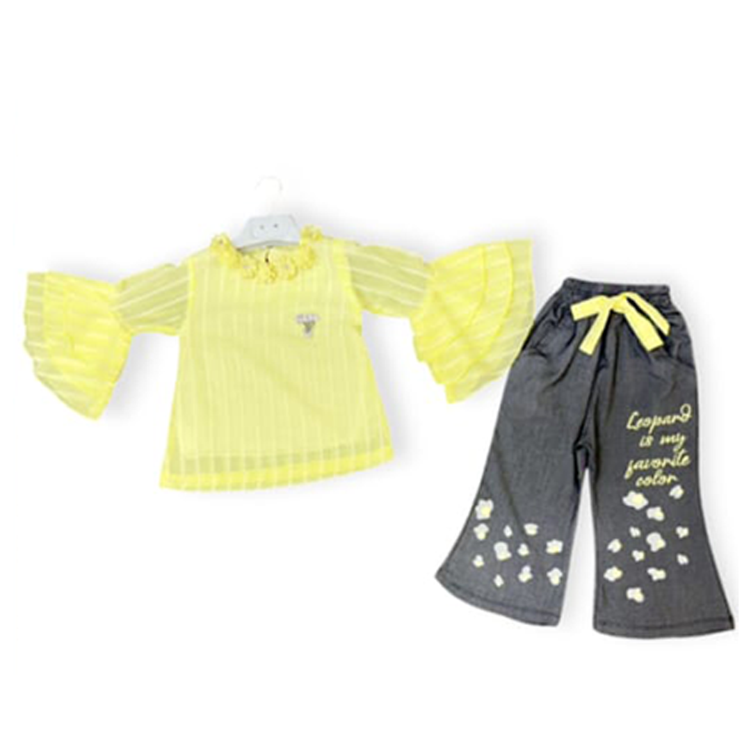 This adorable two-piece set is perfect for the stylish little legend! It features a charming light pink & lime Color top with delicate vertical stripes and beautiful ruffled, bell-shaped sleeves and collar for a graceful look. The top is paired with trendy dark grey trousers that have a playful, cropped cut. The trousers are customized with cute heart graphics and the inspiring phrase "Legend is my favorite color" printed on the leg. The waist has an adjustable tie-up for a comfortable, perfect fit.