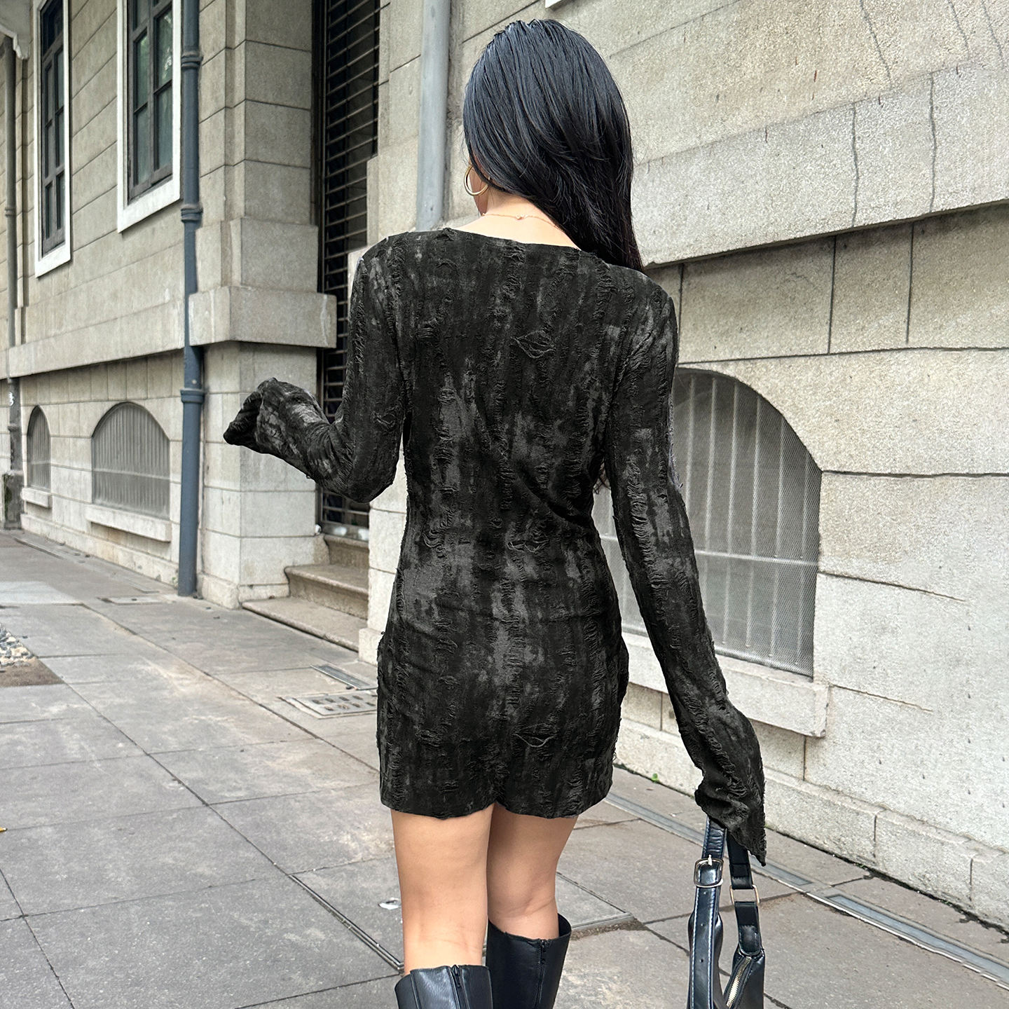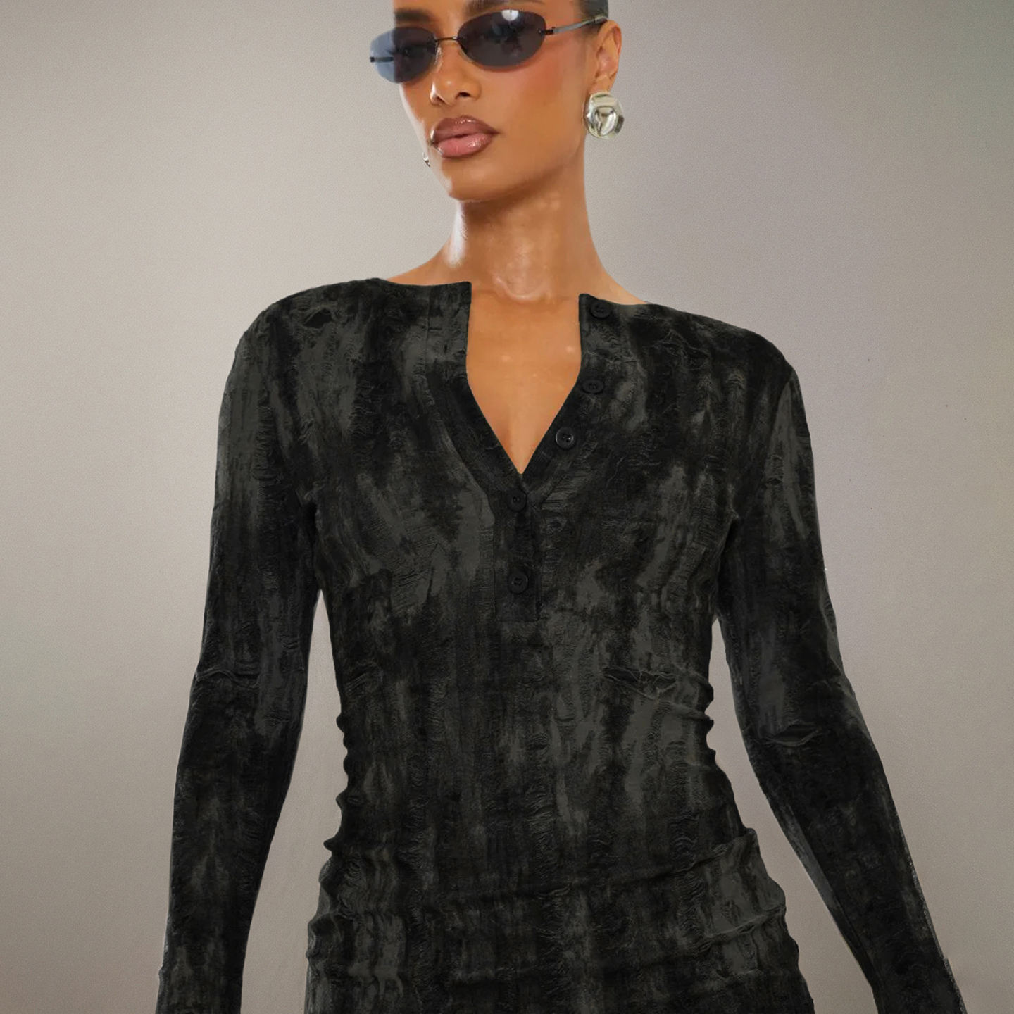 This striking black mini dress features a unique textured burnout or crushed velvet fabric, giving it a rich depth and dimension perfect for evening wear. It is designed with a subtle V-neckline, a front button placket, and long, fitted sleeves, offering a sleek and contemporary silhouette. The short hemline keeps the look modern and bold, while the overall fit remains figure-flattering. Pair this statement piece with minimalist accessories for a chic and high-fashion party look.