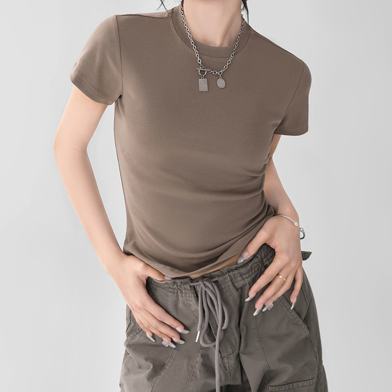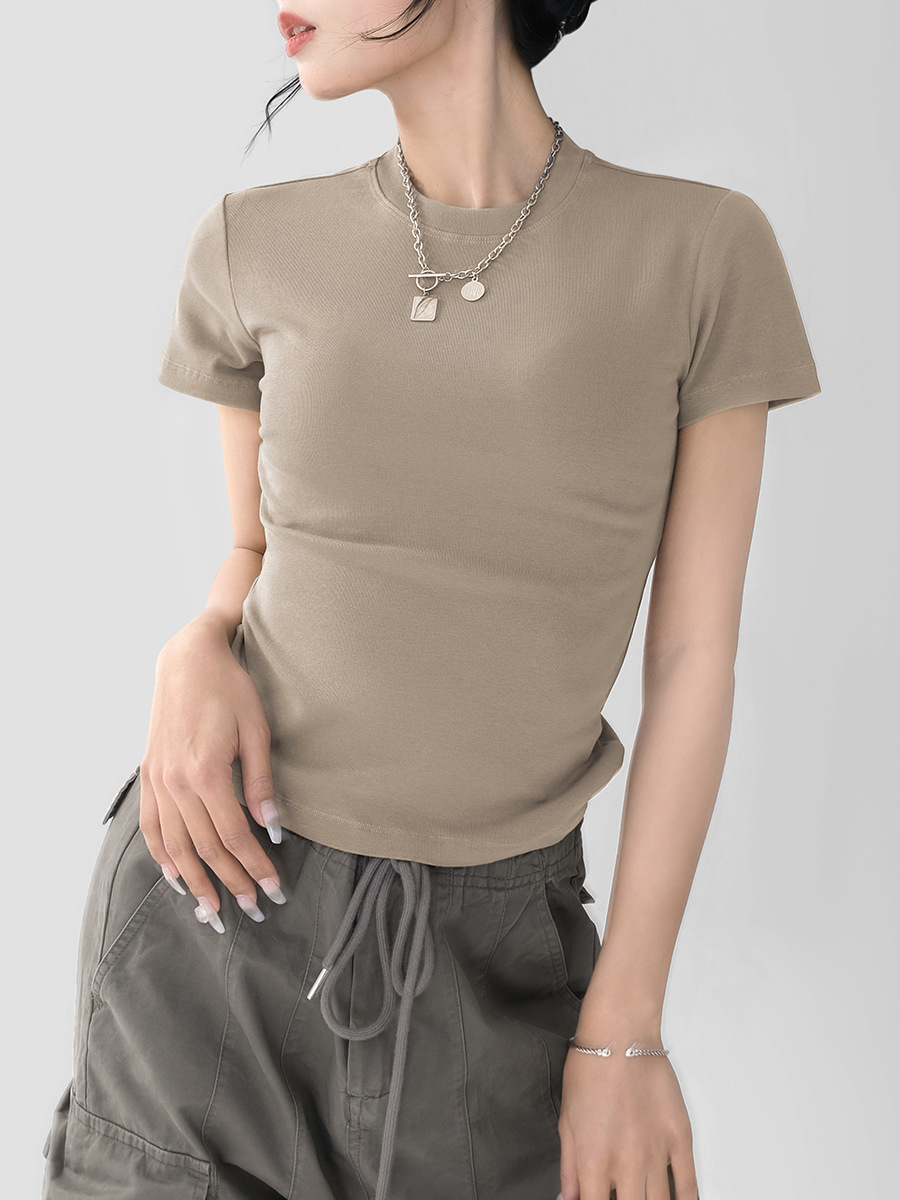 Elevate your everyday rotation with this essential slim-fit tee in a versatile taupe/mocha hue. Paired perfectly with utility bottoms, this look balances casual comfort with a subtle, sleek edge. Accentuated by layered silver jewelry for a touch of modern attitude. An adaptable foundational piece for any minimalist wardrobe.