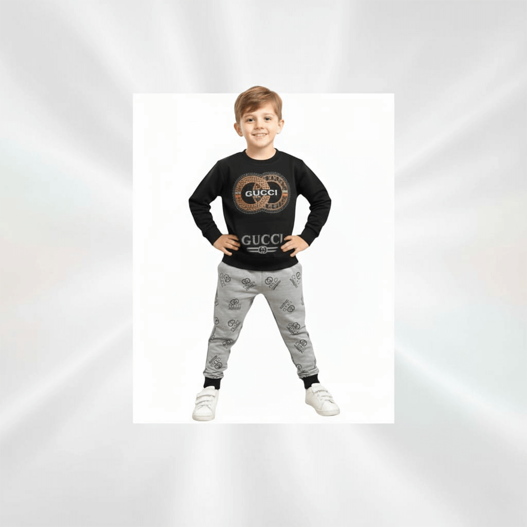 Unleash their inner superstar with this comfortable, stand-out set! The classic black sweatshirt is the centerpiece, featuring a prominent, interlocking 'GUCCI' inspired graphic with a rich, textured, and patterned design. Paired with soft, light grey joggers covered in a subtle, playful logo or pattern print. It’s the ideal outfit for looking cool and staying comfortable through any adventure, from the playground to a casual party.