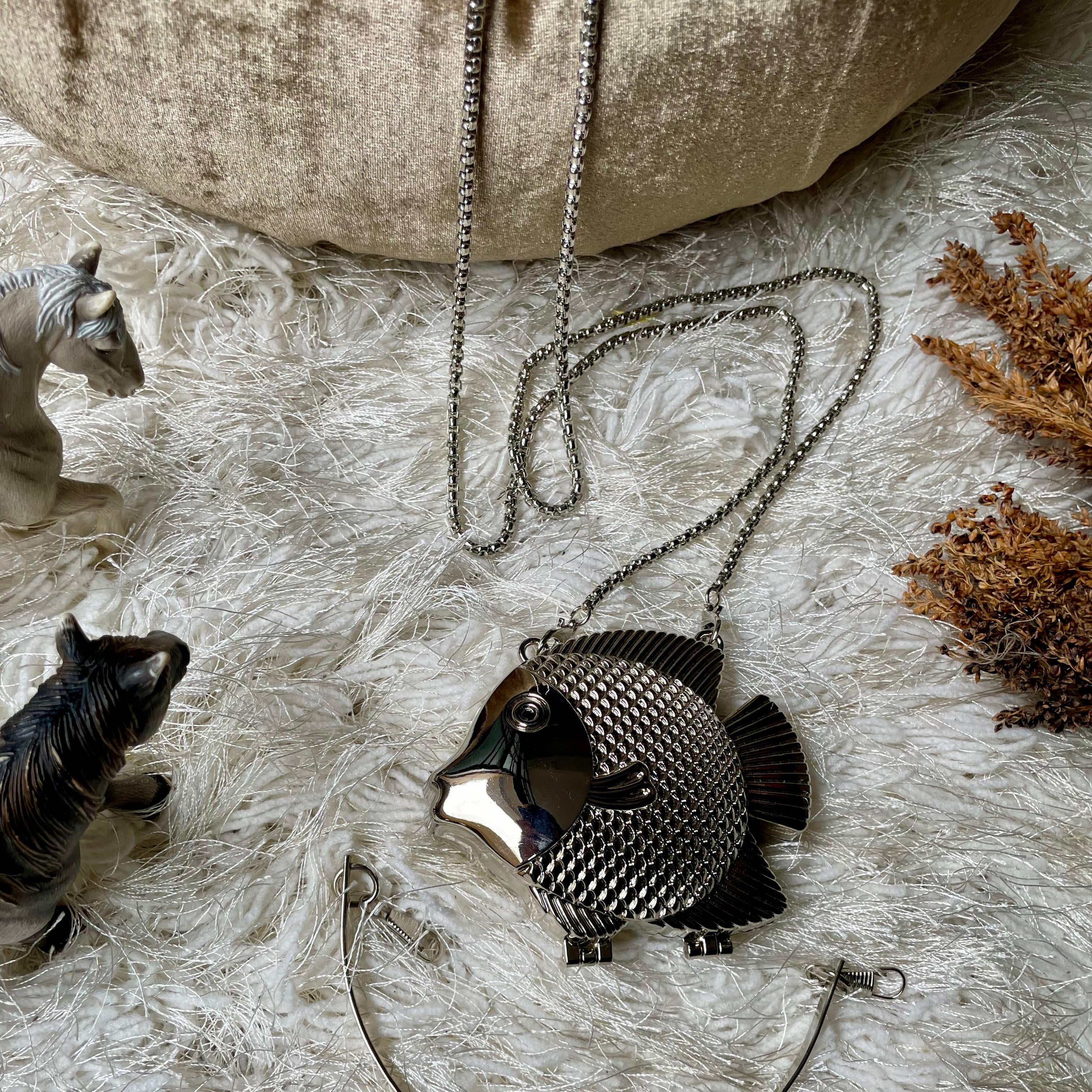 A truly unique accessory shaped like a fish, complete with textured scales and detailed fins. This metallic...