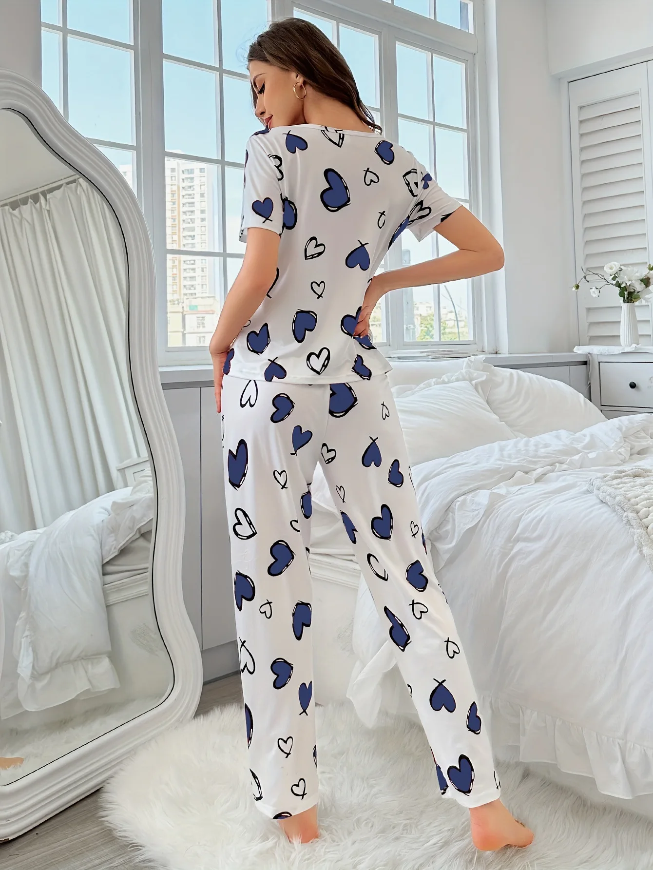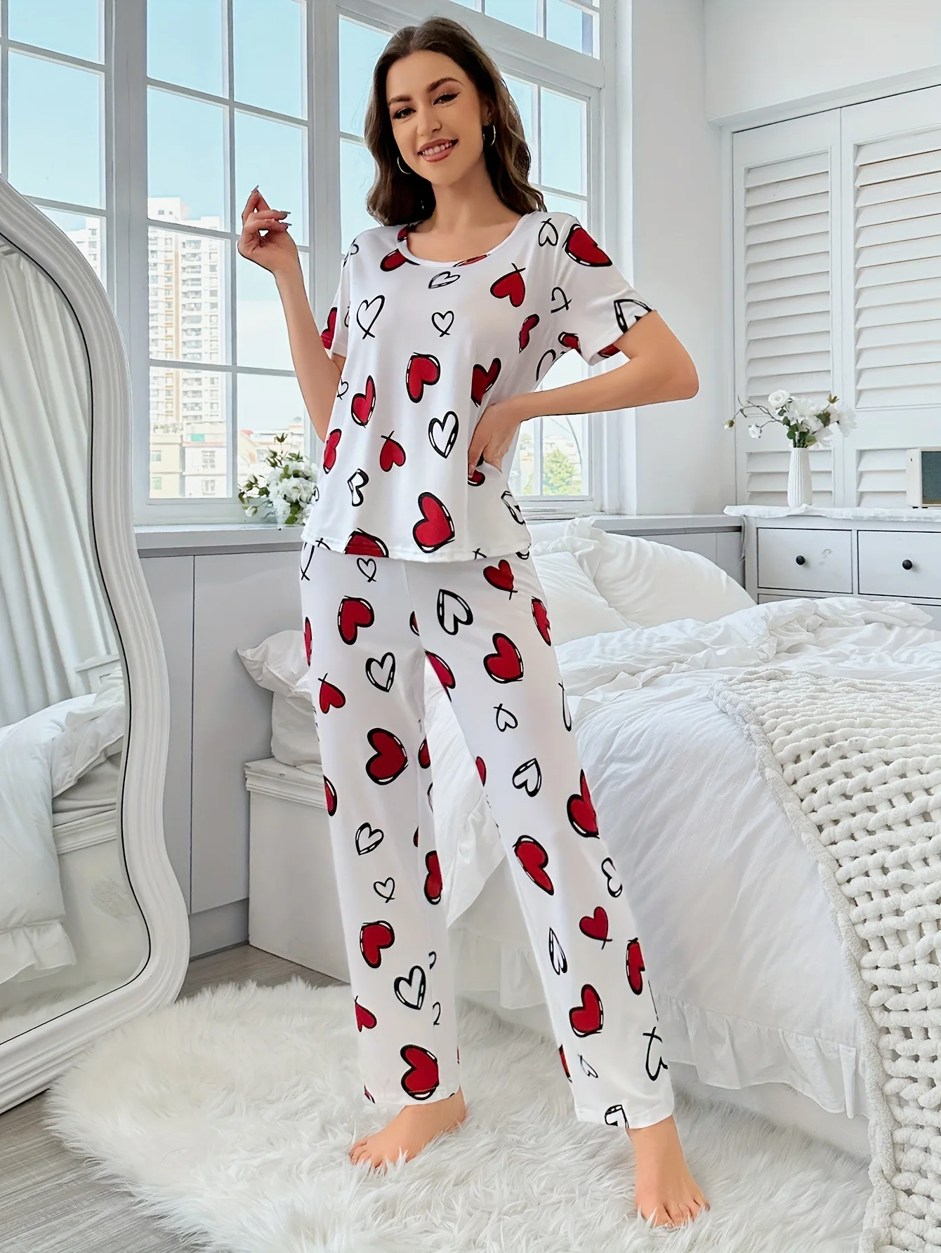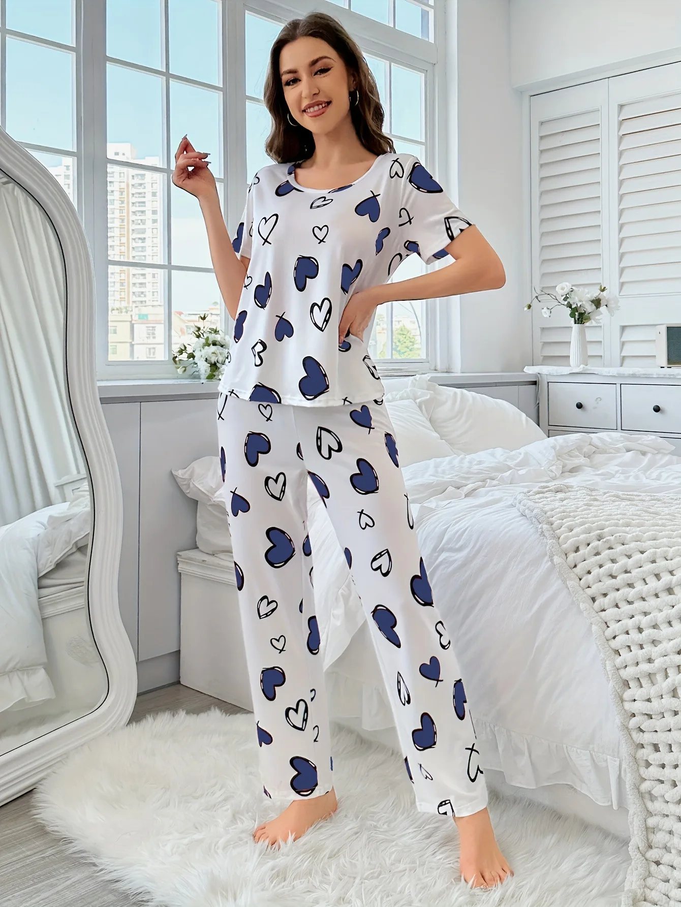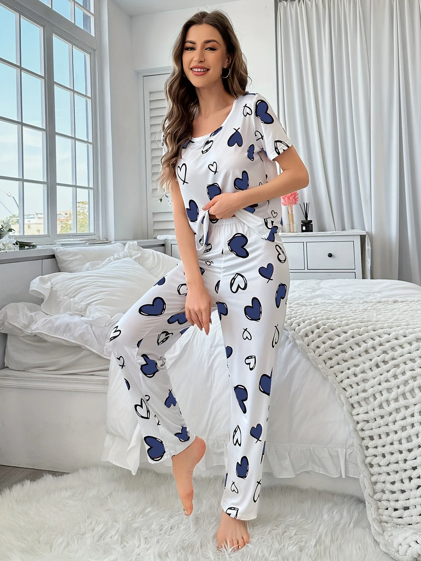 Women's Comfortable Summer Milk Silk Short Sleeve Long Pants Heart Print Casual Homewear Set Pajamas