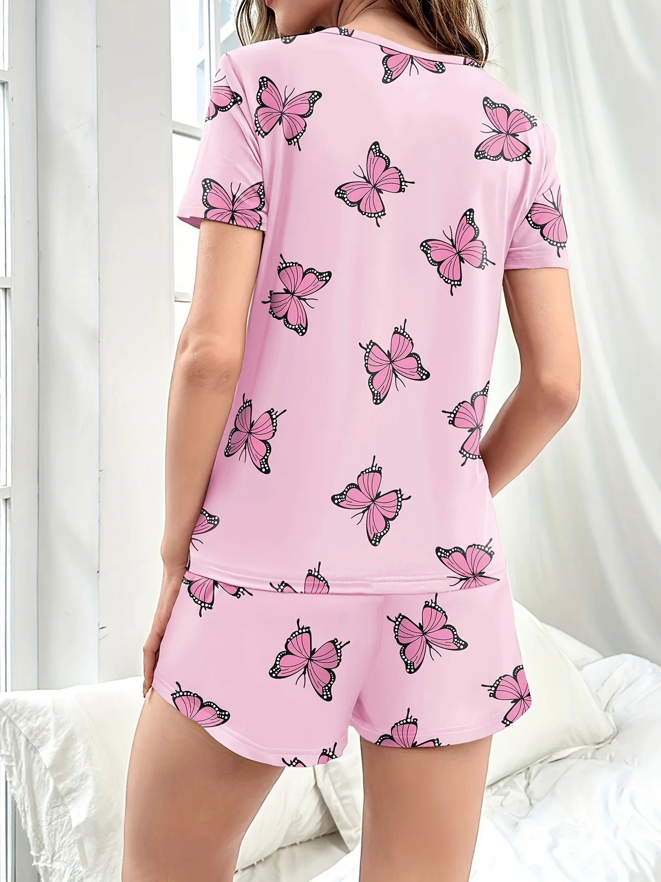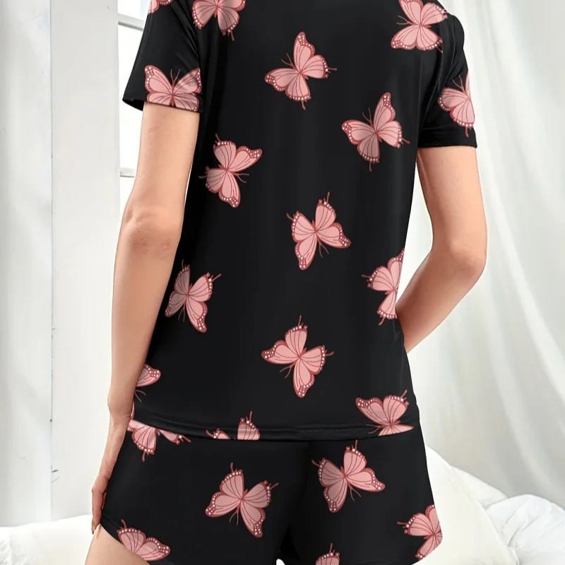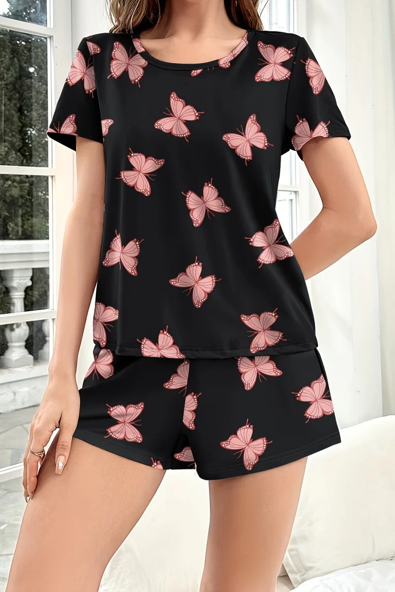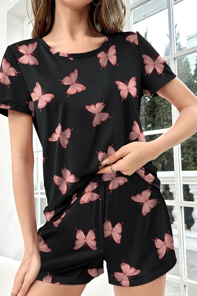 Women's Home Wear Comfortable Casual Two-Piece Pajamas Butterfly Print Short Sleeve Shorts Elastic Waist