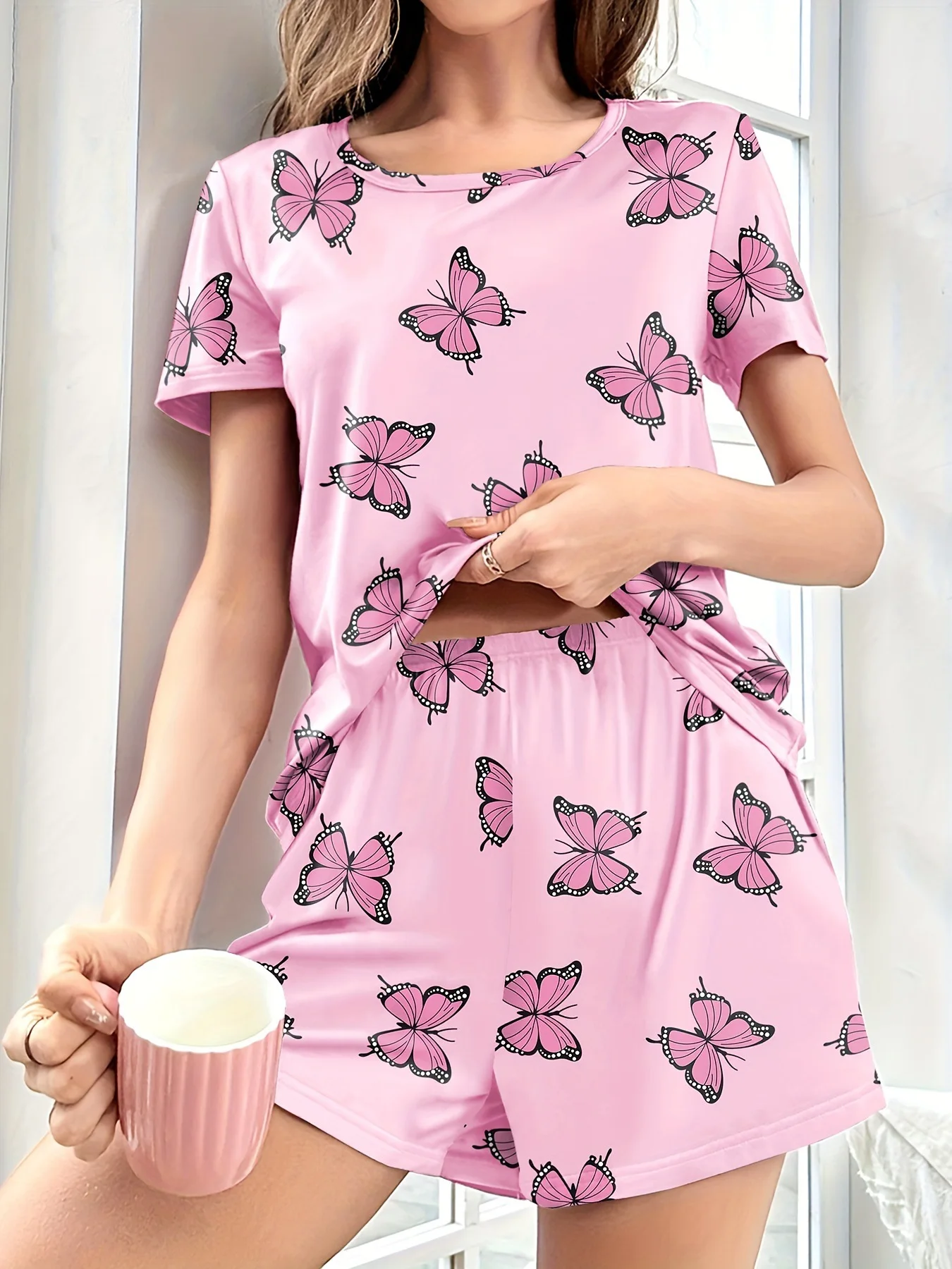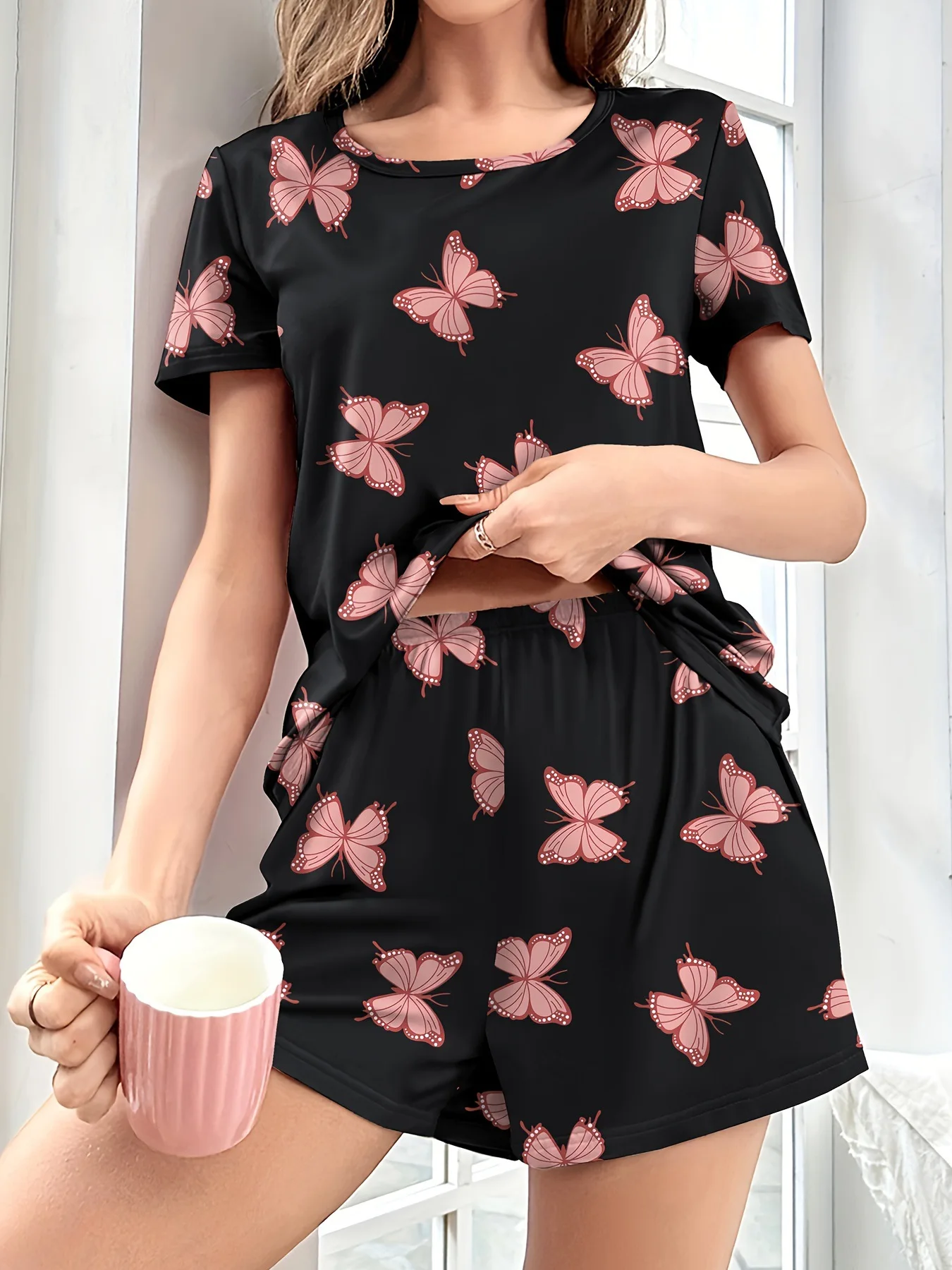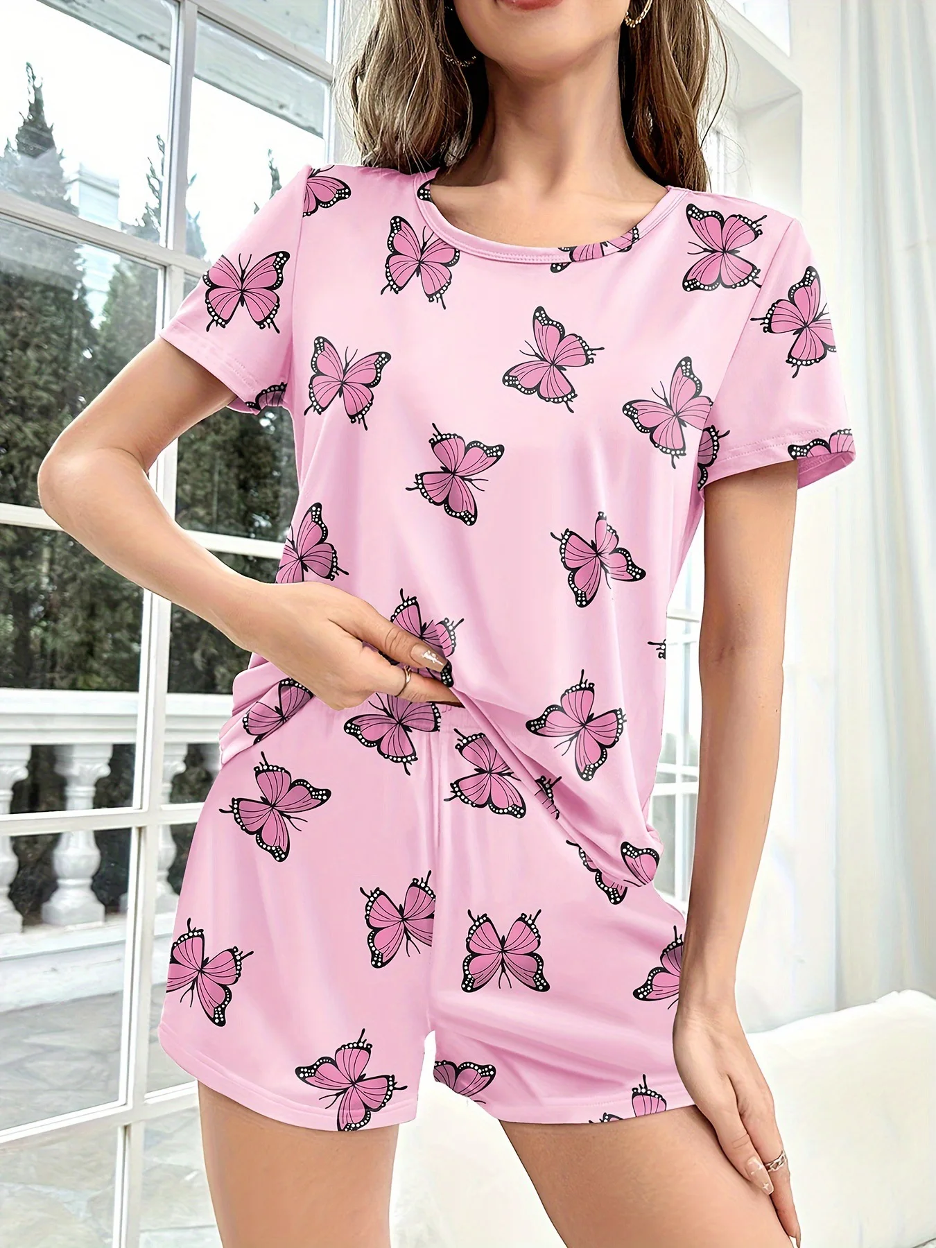 Women's Home Wear Comfortable Casual Two-Piece Pajamas Butterfly Print Short Sleeve Shorts Elastic Waist