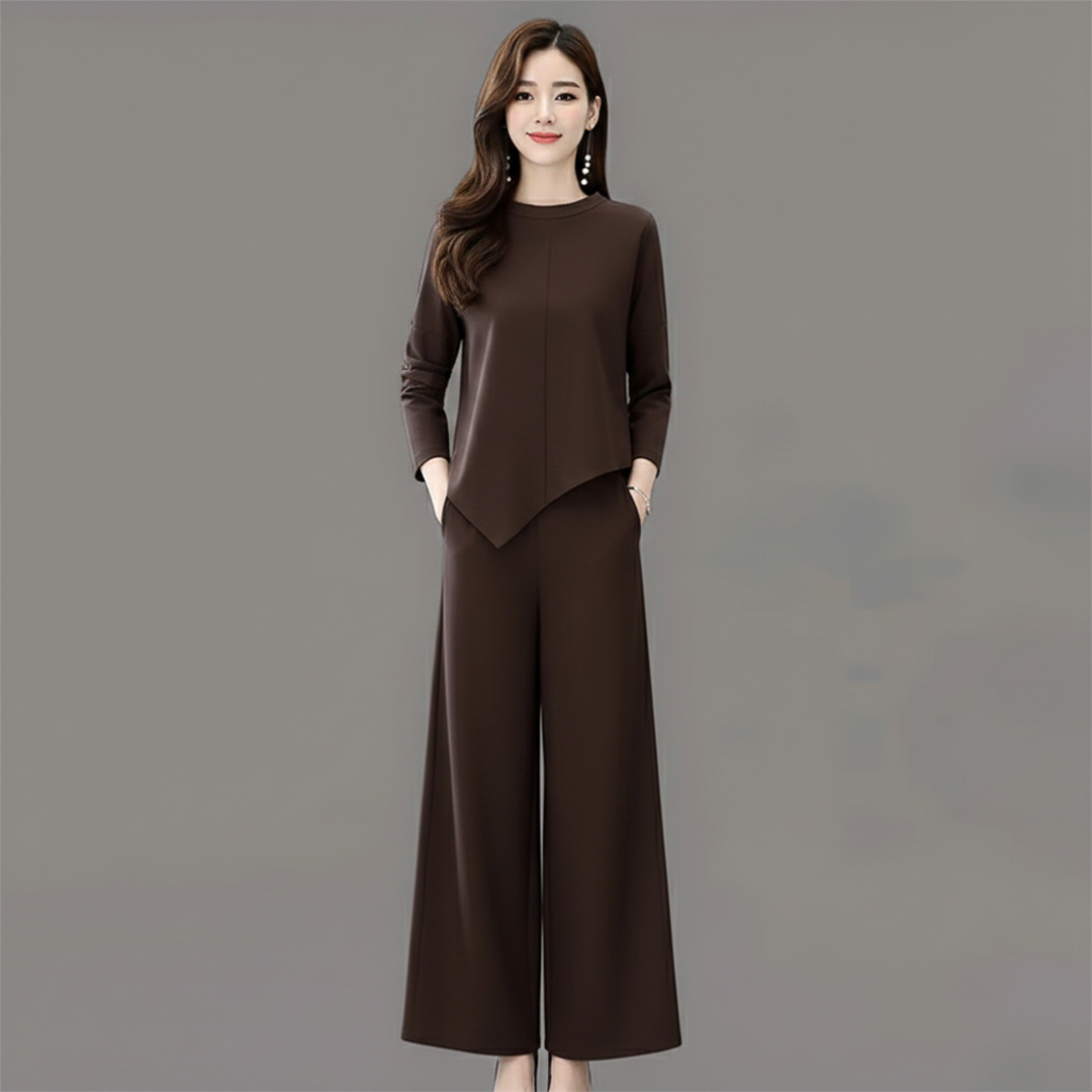 Perfect for Fall/Winter loungewear or elegant casual outings, this Women's Knit Two-Piece Set offers comfort and sophistication. It features a long-sleeved pullover jumper with a flattering asymmetrical hemline, paired with soft, flowing high-waisted palazzo pants. Available in rich, solid colors (Black, Grey, Brown, and Tan), this versatile 'One Size' set ensures cozy, chic style.