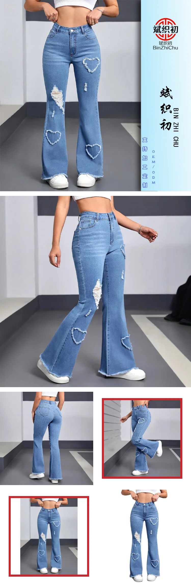 Women's Stretch Heart Pattern Ripped Flared Pants Fashion Casual Flared Jeans