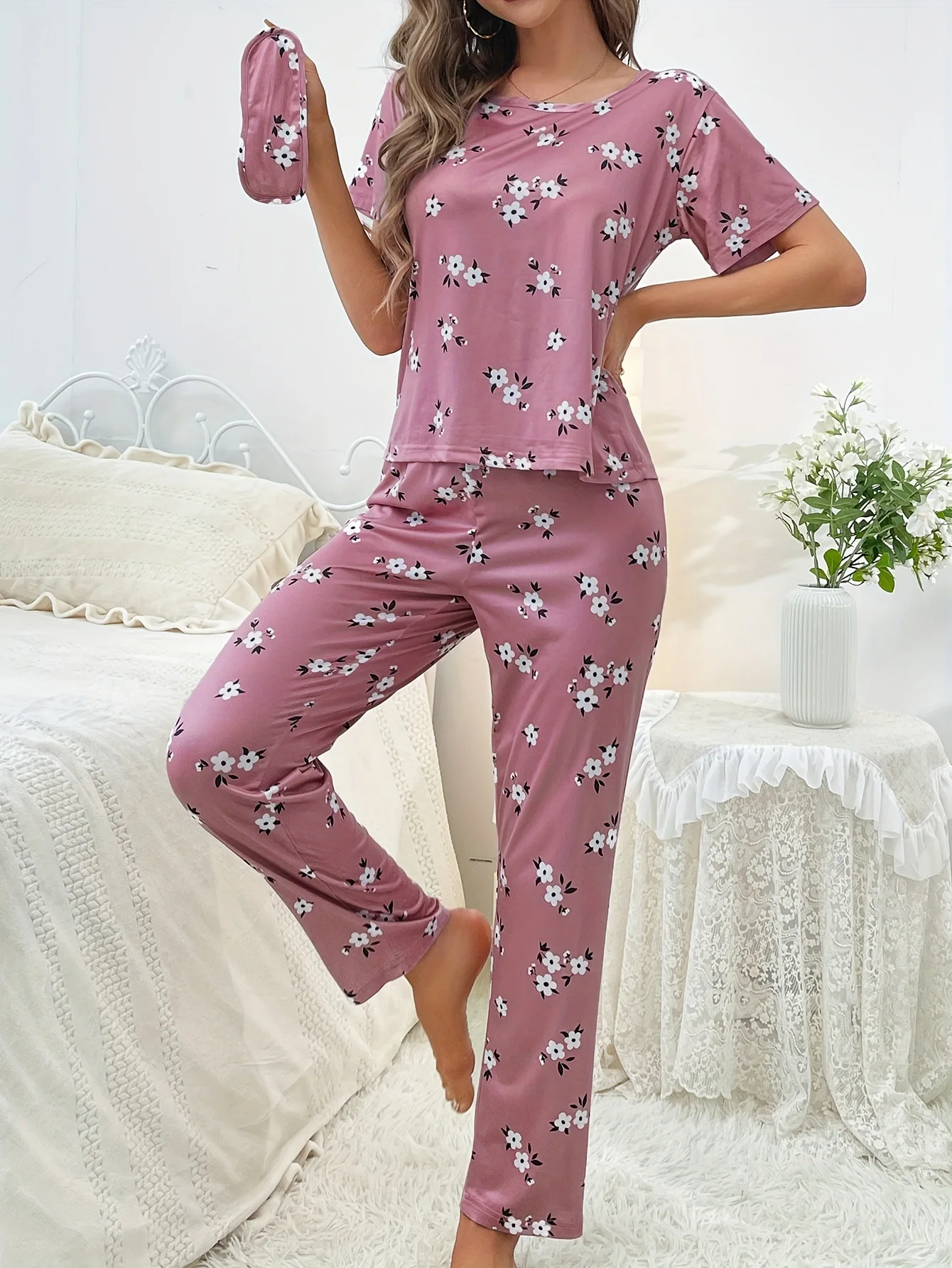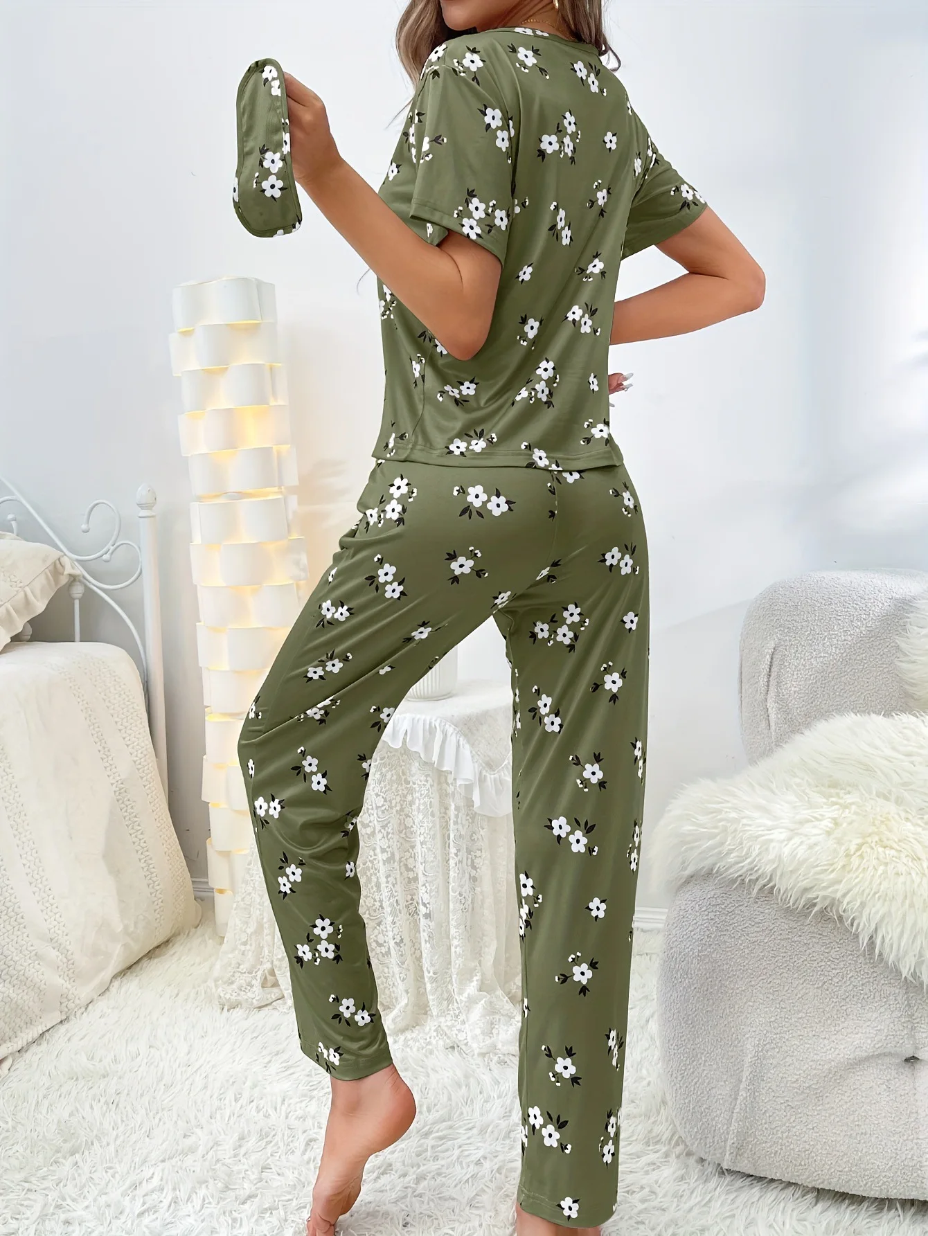 Women's Three-Piece Pajama Set Elastic Waist Full Print Milk Silk Short Sleeve Long Pants Neck