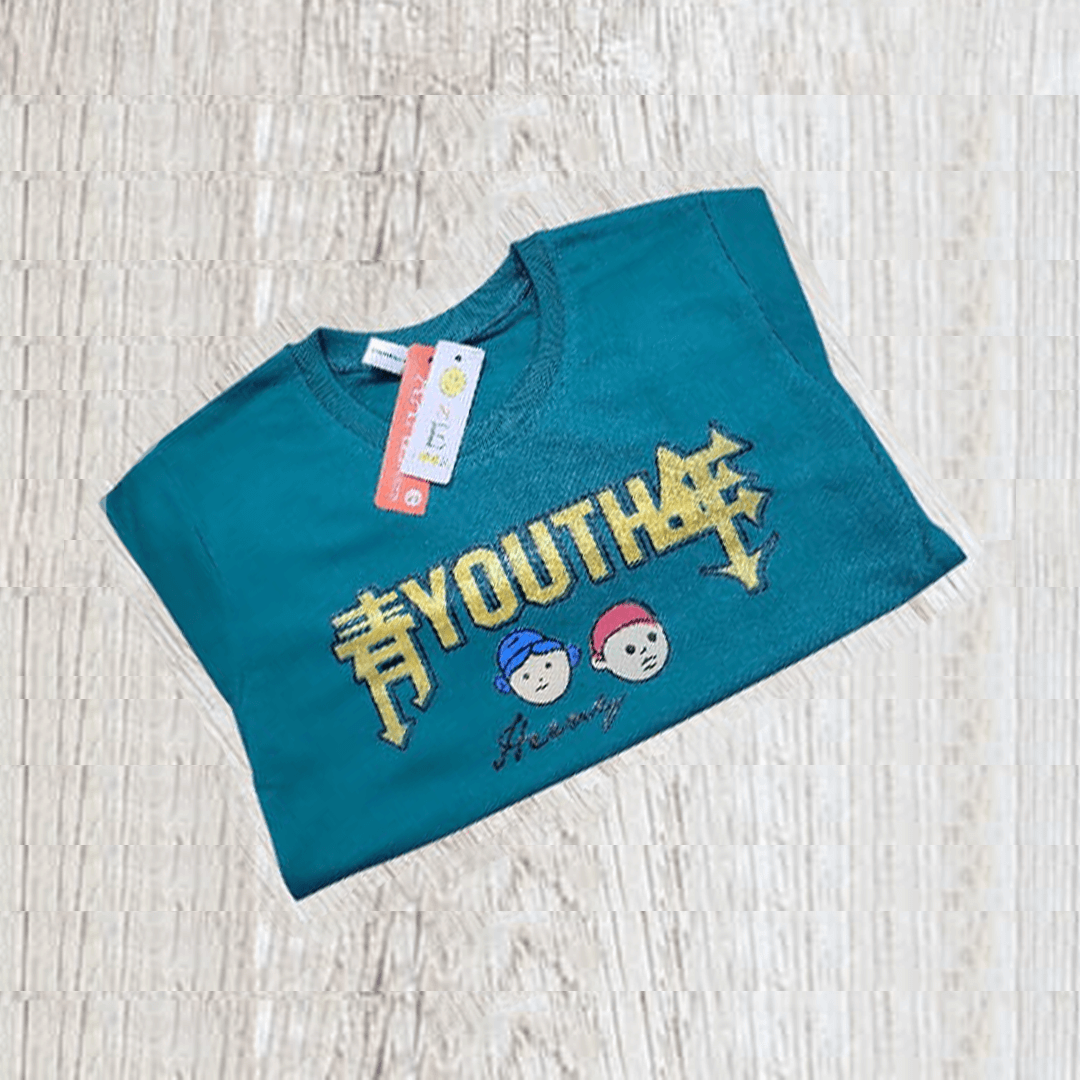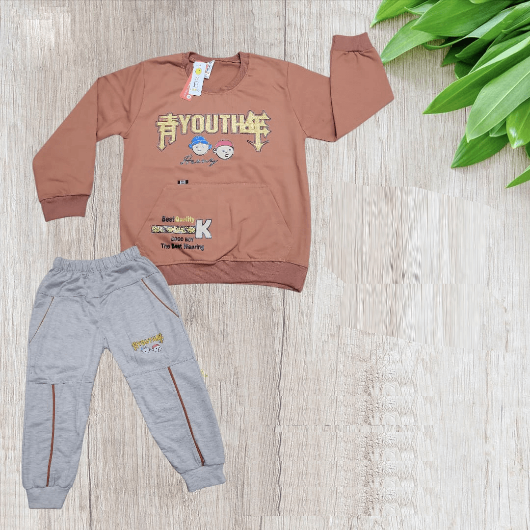 A stylish, warm set featuring a rust-colored sweatshirt with a "YOUTH" graphic print and small cartoon faces....